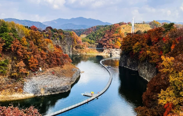 한탕강 물윗길은 굽이치는 모양의 한탄강 중앙에 설치된 트래킹 코스입니다. 가을과 겨울 시즌에 운영하는 코스로, 겨울에는 꽝꽝 언 강이 매력적인 곳입니다. 가을이나 초겨울에 방문한다면, 알록달록 아름답게 물든 나무들을 감상할 수 있습니다.